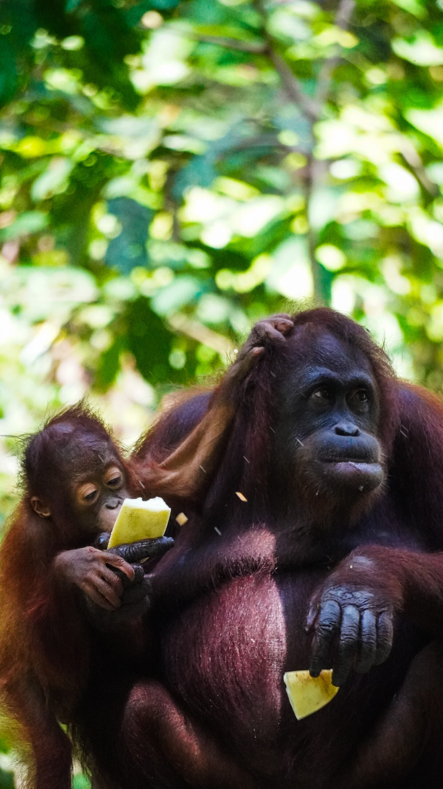 Poi abbiamo visto gli oranghi. Questi giganti pelosi, con occhi capaci di comunicare più di mille parole. I piccoli abbracciati alle madri, stretti come fanno i nostri bambini. Non c’è niente di diverso tra loro e noi: solo un altro modo di vivere l’amore.
